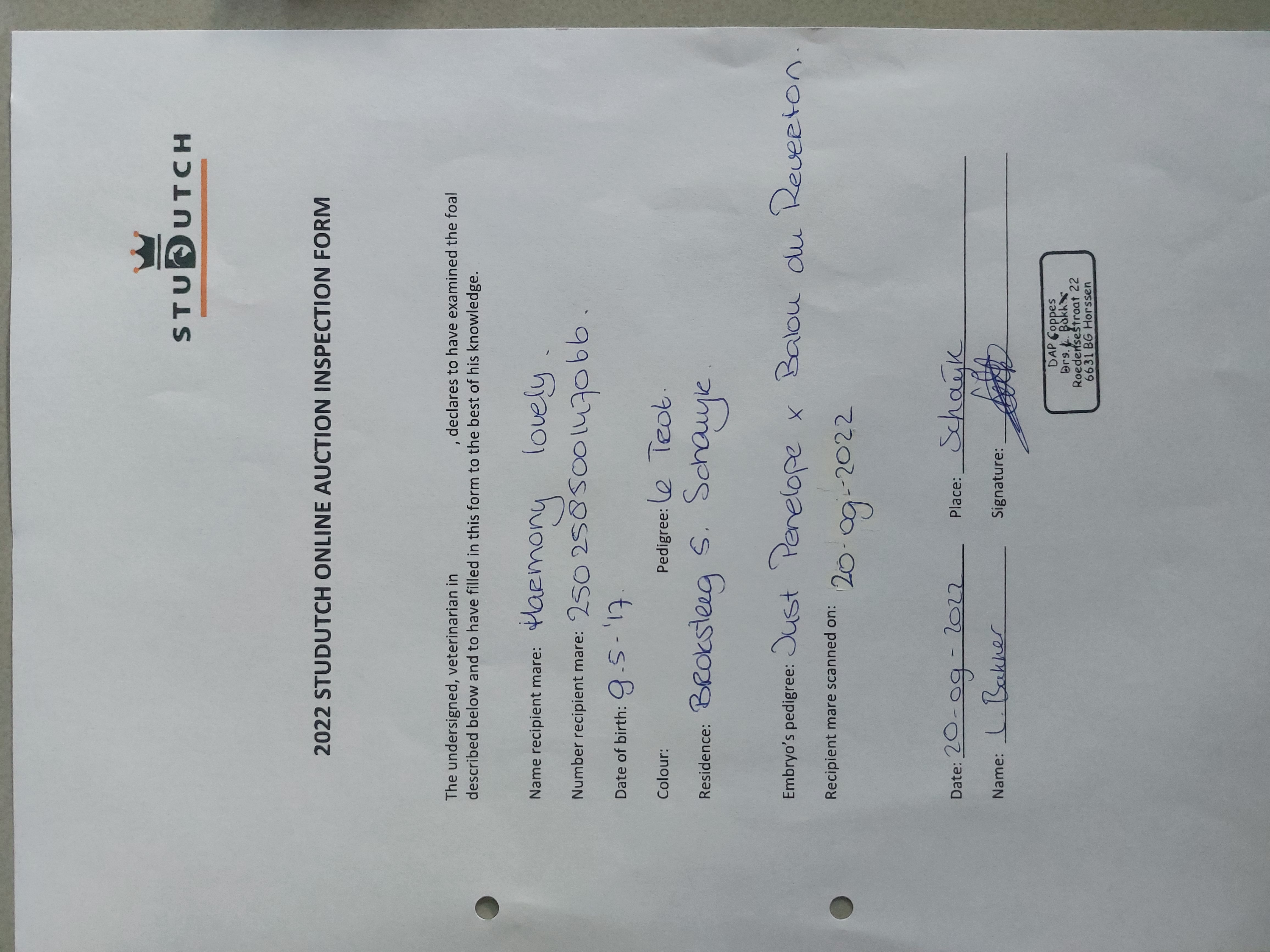 The recepient mare is Harmony Lovely